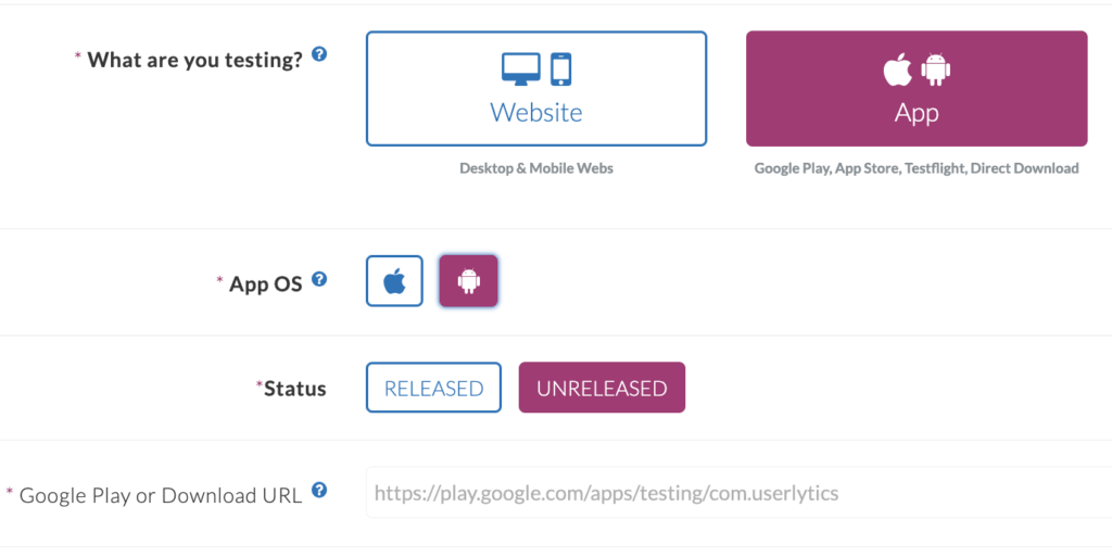 For app testing, you’ll need to specify whether it’s for iOS or Android, as the download URL for the app may differ based on the operating system. You should also indicate the app’s status: “Released” if it’s currently available for download on app stores, and “Unreleased” if it requires TestFlight or a similar platform for testing since it’s not yet publicly available.