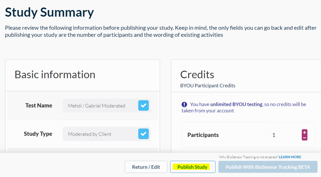 You will then be directed to a summary page with details for your moderated study. Once everything looks good, click on the button on the bottom right-hand corner that says “Publish Study.”