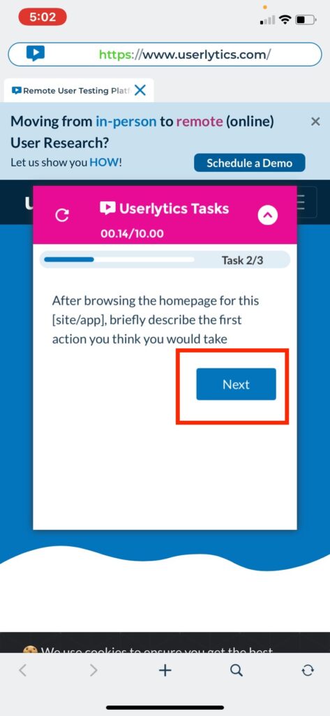 After clicking the “Start” button, your first test task will automatically populate. Be sure to read the instructions thoroughly, and speak out loud if the task asks you to do so. Click the button that says “Next” when you are ready to move on to the next task. Happy testing!