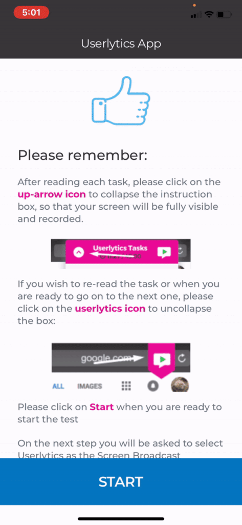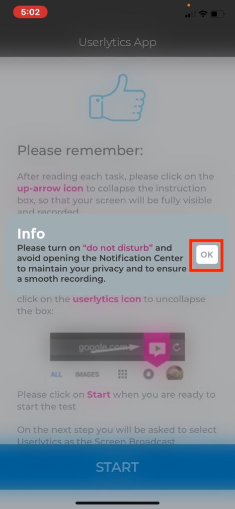 Userlytics requires you to set your phone to “Do Not Disturb” during usability tests because exiting the test screen at any point may cause your test to end prematurely, thus rendering your test results invalid. The “Do Not Disturb” function ensures that an unexpected phone call or text will not disrupt your test. Once your phone is set to “Do Not Disturb,” select the button that says “OK.” If the test does not automatically begin at this point, select the “Start” button at the bottom of the screen.